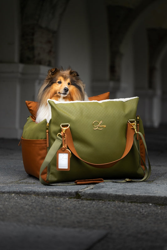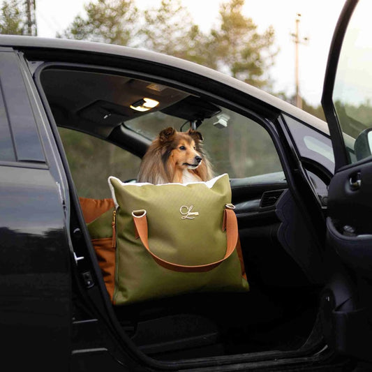 Designer Luxury Dog Car Seat, Olive Green and Tan.